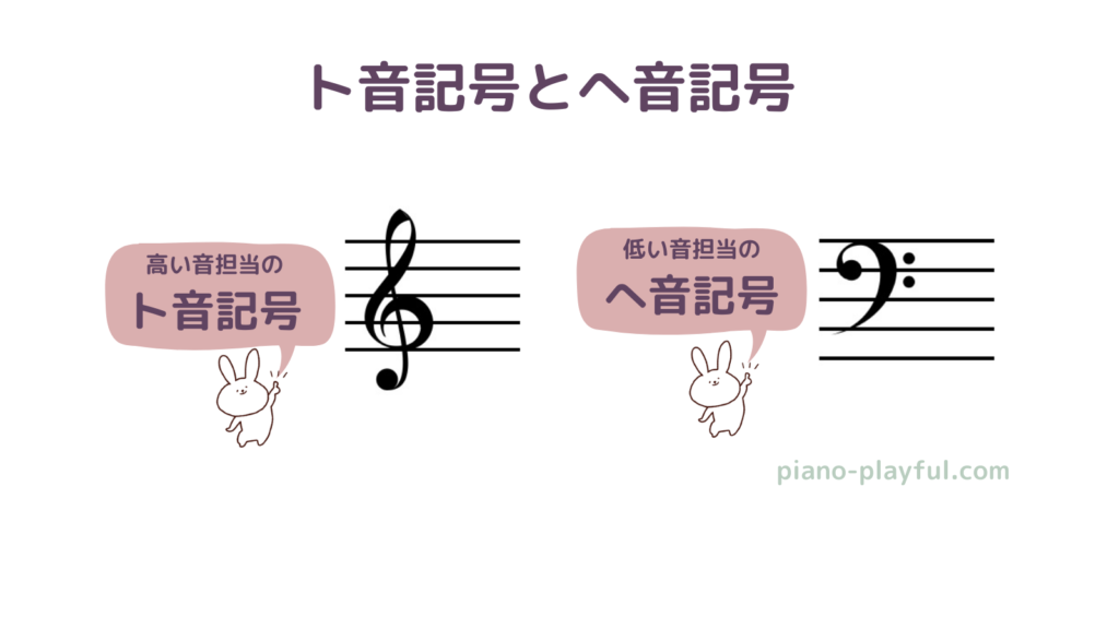 • ト音記号 = 高音部記号(鍵盤の中心あたりから高い方の音を担当)