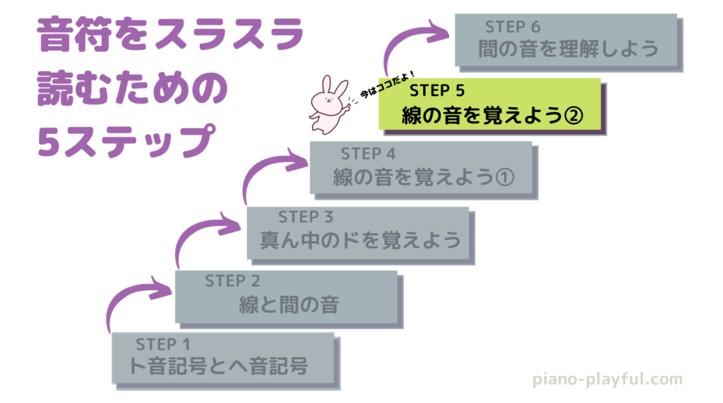 この記事では、【楽譜を読むコツ①音符編】の音符をスラスラ読む方法について6つのスモールステップに分けて解説しています。