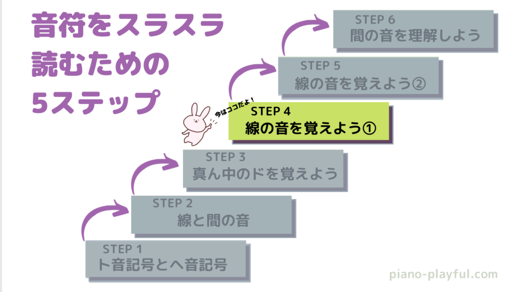 ステップ4では、ト音記号の線の音だけをおぼえましょう。