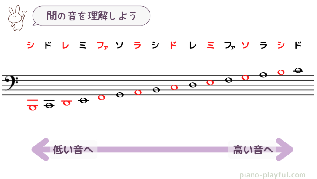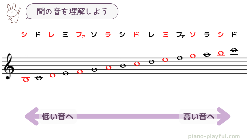 • ト音記号は上(右)へ向かって「ド・ミ・ソ・シ・レ・ファ・ラ・ド」
