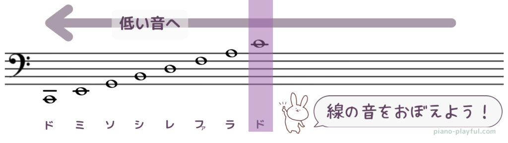 • ヘ音記号は下(左)へ向かって「ド・ラ・ファ・レ・シ・ソ・ミ・ド」