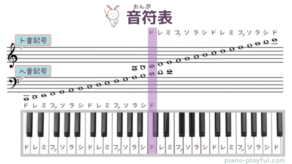 そして、「ト音記号」と「ヘ音記号」をそれぞれ音符表にあてはめるとこうなります。