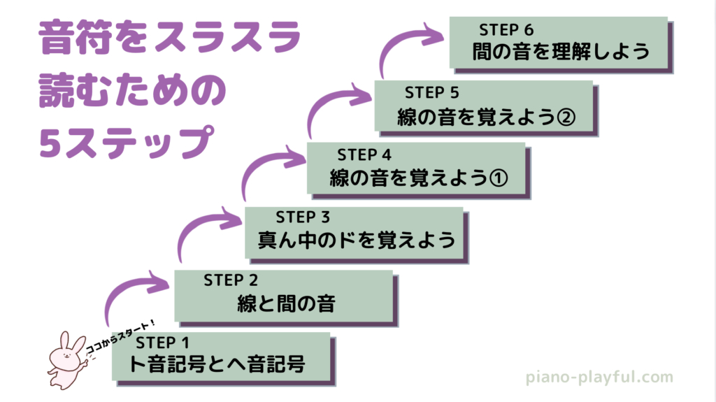 これから紹介する6つのステップを順番に理解していけば、必ず音符を読めるようになりますよ。