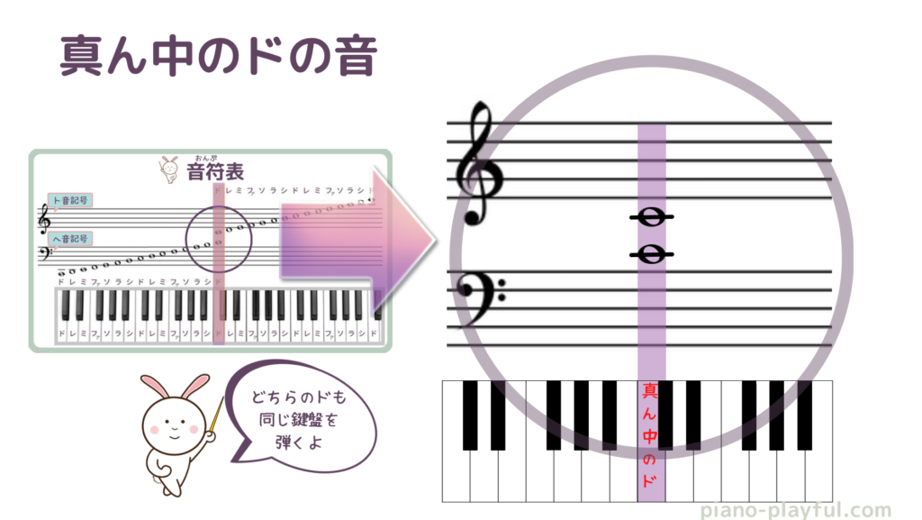 真ん中のドはト音記号もヘ音記号も同じ鍵盤だね!